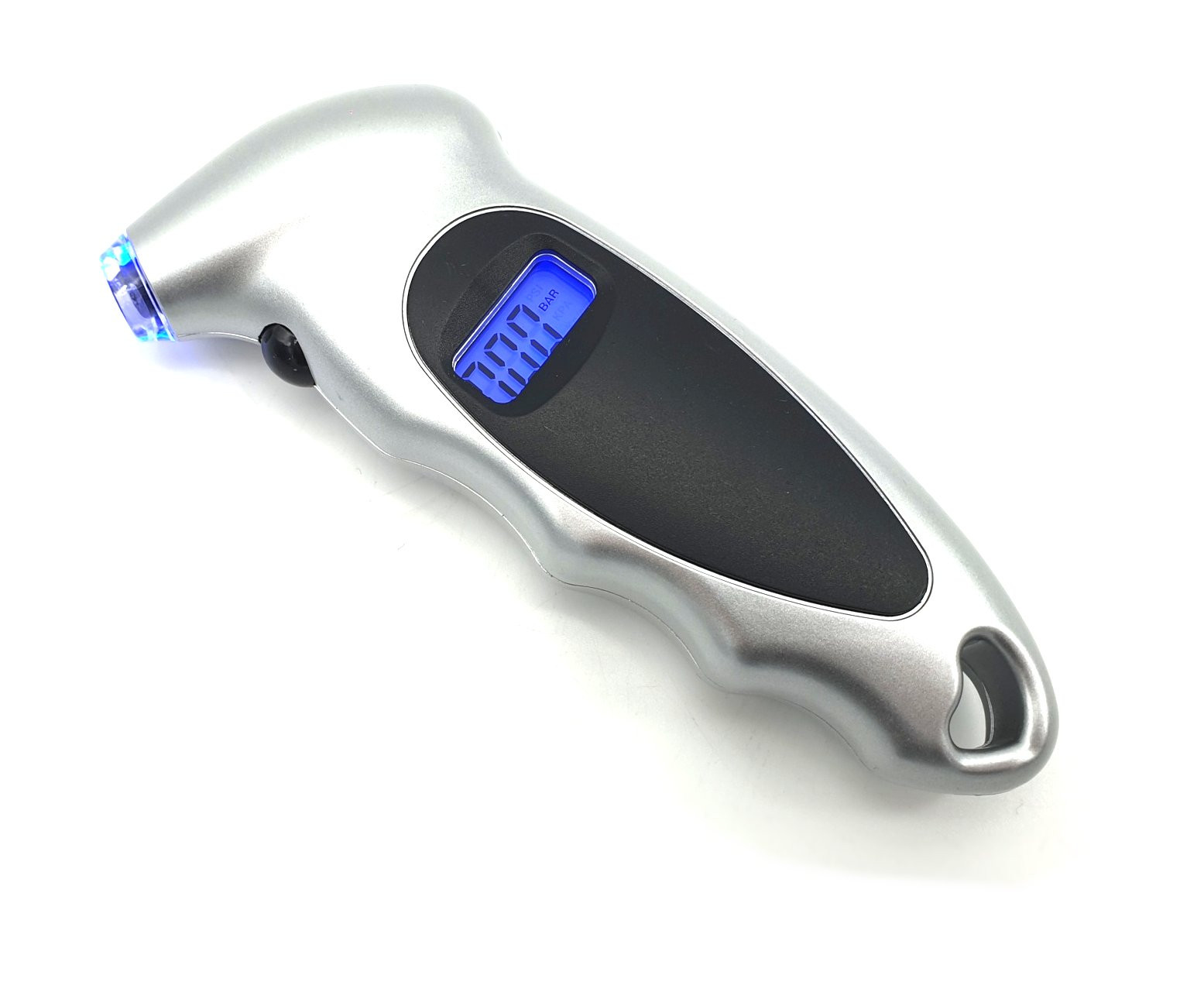 Contrôleur de pression à écran digital, fonction « hold » de l’affichage après la prise de pression.Très pratique avec son angle à 30° afin de bien placer l’orifice de prise de pression sur la valve de votre jante.